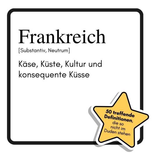 Frankreich ist mehr als nur ein Land - es ist ein Lebensgefühl, das nach Baguette duftet, nach Meer schmeckt und mit einem Augenzwinkern küsst. "Frankreich: Käse, Küste, Kultur und konsequente Küsse" serviert 50 humorvolle Definitionen, die zeigen, warum Frankreich so viel mehr ist als Klischees. Von der Croissant-Kunst bis zur Pétanque-Philosophie, von der Côte d'Azur bis zum Mont Blanc - hier wird gelacht, gestaunt und geschmunzelt.Für wen dieses Buch optimal geeignet ist:- Für Frankreich-Fans mit Sinn für Humor- Für Genießer, die mehr als nur Reiseführer suchen- Für alle, die französische Lebensart lieben und schätzenEin Geschenk, das Frankreich von seiner charmantesten Seite zeigt - mit Witz, Esprit und einer Prise Selbstironie.Was beim Kauf dieses Buches erwartet werden kann:- 50 witzige Definitionen rund um Frankreich- Passende Illustrationen zu jedem Thema- Originelle Einblicke in Land, Leute und Küche- Perfekt für Frankreich-Liebhaber und Neugierige