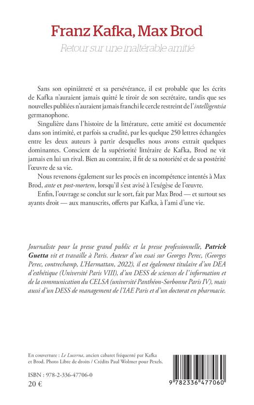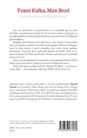 Sans son opiniâtreté et sa persévérance, il est probable que les écrits de Kafka n'auraient jamais quitté le tiroir de son secrétaire, tandis que ses nouvelles publiées n'auraient jamais franchi le cercle restreint de l'intelligentsia germanophone. Singulière dans l'histoire de la littérature, cette amitié est documentée dans son intimité, et parfois sa crudité, par les quelque 250 lettres échangées entre les deux auteurs à partir desquelles nous avons extrait quelques dominantes. Conscient de la supériorité littéraire de Kafka, Brod ne vit jamais en lui un rival. Bien au contraire, il fit de sa notoriété et de sa postérité l'oeuvre de sa vie. Nous revenons également sur les procès en incompétence intentés à Max Brod, ante et post-mortem, lorsqu'il s'est avisé à l'exégèse de l'oeuvre. Enfin, l'ouvrage se conclut sur le sort, fait par Max Brod - et surtout ses ayants droit - aux manuscrits, offerts par Kafka, à l'ami d'une vie.