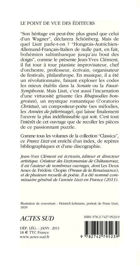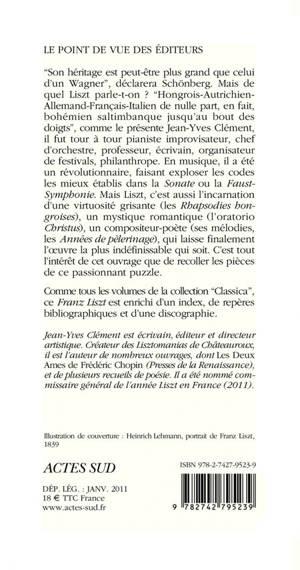 "Hongrois-autrichien-allemand-français-italien de nulle part, en fait, bohémien-saltimbanque jusqu'au bout des doigts" selon les mots de l'auteur, combien y a-t-il de Franz Liszt ? Incarnation d'une virtuosité grisante (les Rhapsodies hongroises), mystique romantique (l'oratorio Christus), compositeur-poète (ses mélodies, les Années de pèlerinage)... A l'occasion du deux-centième anniversaire de la naissance du compositeur, Jean-Yves Clément recompose ce passionnant puzzle.