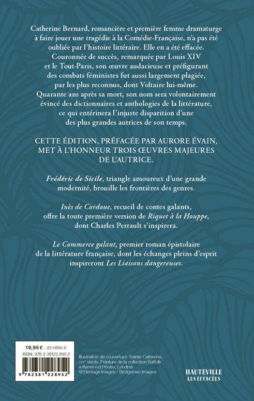 Avec Frédéric de Sicile, Catherine Bernard explore un triangle amoureux d'une modernité brouillant les frontières des genres. C'est à un amour interdit qu'elle s'intéresse dans son recueil Inès de Cordoue tout en proposant avec Riquet à la houppe la première évocation du conte avant que Charles Perrault ne s'en empare. Avec Le Commerce galant, elle signe le premier roman épistolaire de la littérature française, dont les échanges pleins d'esprit inspireront Les Liaisons dangereuses.