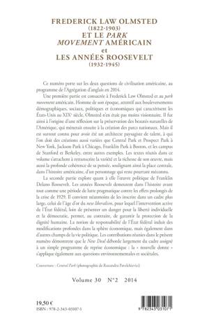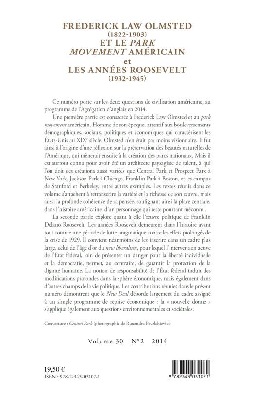 Ce numéro porte sur les deux questions de civilisation américaine au programme de l'Agrégation d'anglais 2014. Une première partie est consacrée à Frederick Law Olmsted et au park movement américain. Il initia notamment une réflexion sur la préservation des beautés naturelles de l'Amérique, qui se concrétisa par la création de parcs nationaux. Architecte paysagiste, il est le créateur de Central Park et Prospect Park à New York, Franklin Park à Boston et les campus de Stanford et Berkeley.