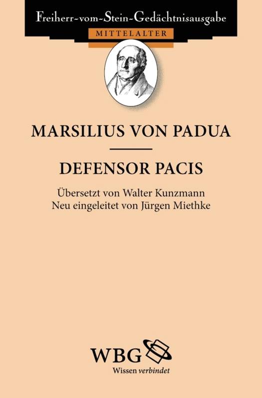 Marsilius von Padua hat mit seinem Defensor Pacis die wichtigste Schrift der spätmittelalterlichen Staatstheorie geschaffen. Geprägt vom Konflikt zwischen geistlicher und weltlicher Macht, der das ganze Mittelalter durchzog, und mit dem Ziel, den Frieden zu erhalten, erhob Marsilius eine revolutionäre Forderung: die weitgehende Entmachtung des Papstes und das Prinzip der Volkssouveränität.