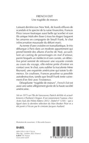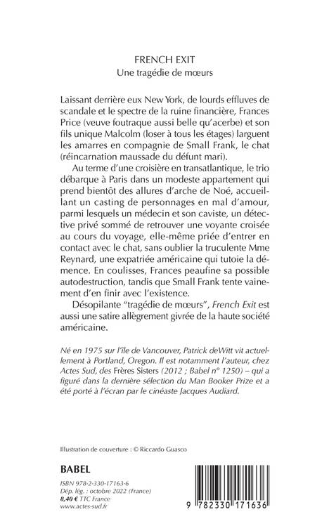 Laissant derrière eux New York, de lourds effluves de scandale et le spectre de la ruine financière, Frances Price (veuve foutraque aussi belle qu'acerbe) et son fils unique Malcolm (loser à tous les étages) larguent les amarres en compagnie de Small Frank, le chat (réincarnation maussade du défunt mari). Au terme d'une croisière en transatlantique, le trio débarque à Paris dans un modeste appartement qui prend bientôt des allures d'arche de Noé, accueillant un casting de personnages en mal d'amour, parmi lesquels un médecin et son caviste, un détective privé sommé de retrouver une voyante croisée au cours du voyage, elle-même priée d'entrer en contact avec le chat, sans oublier la truculente Mme Reynard, une expatriée américaine qui tutoie la démence. En coulisses, Frances peaufine sa possible autodestruction, tandis que Small Frank tente vainement d'en finir avec l'existence. Désopilante "tragédie de moeurs", "French Exit" est aussi une satire allègrement givrée de la haute société américaine.