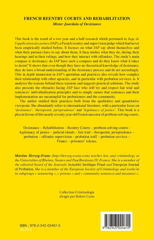This book is the result of a two year and a half research which pertained to Juge de l'application des peines (JAP), a French reentry and supervision judge which had never been empirically studied before. The author studied their pratices both from the qualitative and quatitative viewpoint. She abundantly refers to international literature, with a particular focus on "desistance", "therapeutic jurisprudence" and "legitimacy of justice".