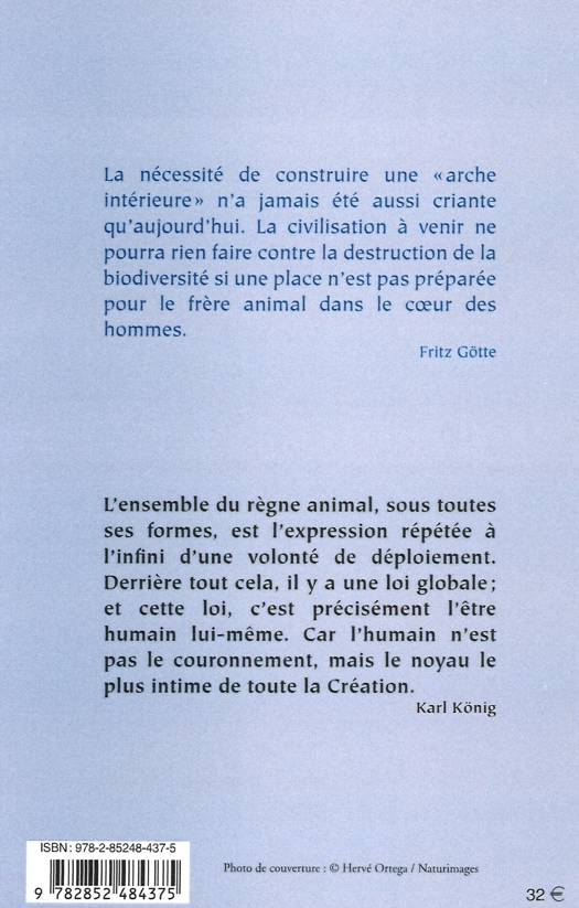 Le merveilleux livre de Karl König reparaît enfin en français ! Lors de sa première édition dans les années 1960, il fut, avec Printemps silencieux de Rachel Carson, un des ouvrages qui lança le mouvement écologique moderne. Cette nouvelle version a été revue et complétée par des notes de Wolfgang Schad. La pensée et la sensibilité de Karl König, fondées sur la fraternité, s’appliquaient aux humains comme aux animaux. Ses considérations sur les animaux permettent une approche imaginative de cet univers fascinant et une compréhension approfondie du processus de l’Évolution. En fin de compte, König montre le lien indissociable entre l’homme et l’animal ainsi que la nécessité de prendre en compte le destin actuel des animaux et de préserver leur dignité. La nécessité de construire une « arche intérieure » n’a jamais été aussi criante qu’aujourd’hui. La civilisation à venir ne pourra rien faire contre la destruction de la biodiversité si une place n’est pas préparée pour le frère animal dans le coeur des hommes. (Fritz Götte) L’ensemble du règne animal, sous toutes ses formes, est l’expression répétée à l’infini d’une volonté de déploiement. Derrière tout cela, il y a une loi globale ; et cette loi, c’est précisément l’être humain lui-même. Car l’humain n’est pas le couronnement, mais le noyau le plus intime de toute la Création. (Karl König)