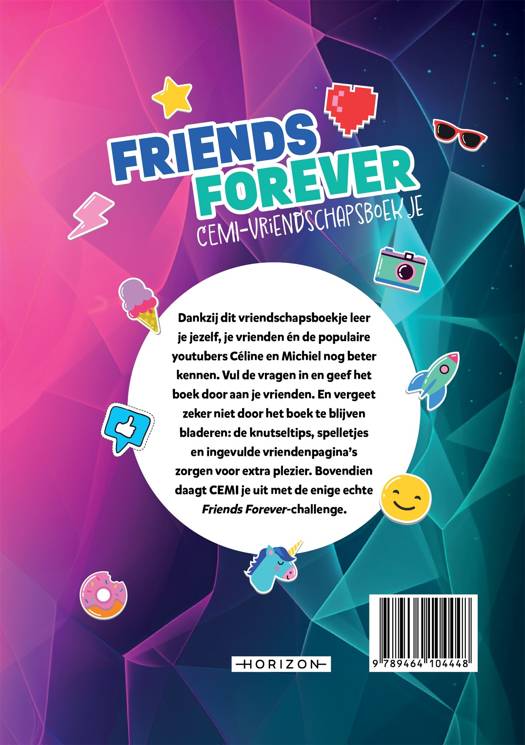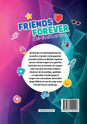 Dankzij dit vriendschapsboekje van het populaire YouTube-duo CEMI leer je jezelf, je vrienden én Céline en Michiel nog beter kennen. Vul de vragen in, geef het boek door van de ene vriend naar de andere en vergeet niet door het boek te blijven bladeren: de knutseltips, spelletjes en ingevulde vriendenpagina's zorgen voor extra plezier. Bovendien dagen Céline en Michiel je uit met de enige echte Friends Forever-challenge.