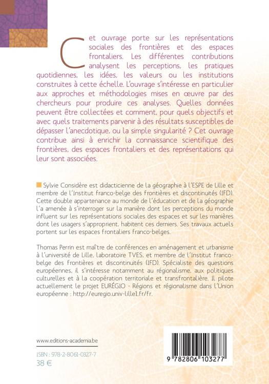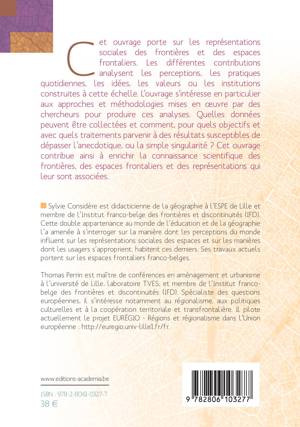 Cet ouvrage porte sur les représentations sociales des frontières. Il s'intéresse aux approches et méthodologies mises en uvre pour analyser ces représentations : quelles données peuvent être collectées et comment, pour quels objectifs et avec quels traitements parvenir à des résultats susceptibles de dépasser l'anecdotique, ou la simple singularité ? L'ouvrage contribue ainsi à enrichir la connaissance des frontières, des espaces frontaliers et des représentations qui leur sont associées.