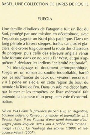 Une famille d'Indiens de Patagonie fuit un îlot du Sud, protégé par une mission en décrépitude, avec l'espoir de gagner un Nord plus pacifique. Dans un long périple à travers steppes, forêts, canaux et glaciers, elle croise tragiquement la route des chasseurs de phoques, puis celle des éleveurs anglais venus faire fortune dans ce nouveau Far West, et qui s'apprêtent à déclarer les Indiens "calamité nationale". Ni témoignage ni document ethnographique, Fuegia est un roman au souffle inoubliable, hanté par les souffrances de ceux qui vivaient encore, il y a à peine un siècle, en cette région du bout du monde : la Terre de Feu. Dans un sublime décor battu par la mer et les tempêtes, ce livre mémorial fait entendre la clameur d'un peuple en voie d'extermination.