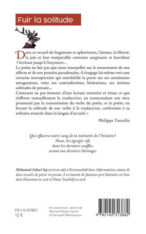 Dans ce recueil de fragments et aphorismes, l'amour, la liberté, la joie et leur inséparable contraire surgissent et harcèlent l'écriture jusqu'à l'oxymore... Le poète ne fait pas que nous interpeller sur le mouvement de nos affects et de nos pensées paradoxales, il s'engage lui-même vers une certaine introspection qui entrebâille la porte sur ses sentiments antagonistes, voire ses contradictions, hésitations, ses intimes solitudes de pensée... Comment ne pas honorer d'une lecture attentive et émue ce que s'offrent mutuellement la traductrice, en transcendant son vécu personnel par la transmission du verbe du poète, et le poète, en livrant la solitude de son verbe à la traductrice, confrontée à sa solitaire avancée dans la langue d'accueil. Philippe Tancelin Qui effacera notre sang de la mémoire de l'histoire ? Nous, les égorgés vifs dont les derniers souffles seront nos derniers héritages