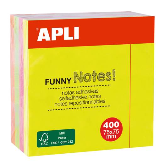 Bloc de 400 feuilles de notes adhésives de 75 x 75 mm en 4 couleurs fluo différentes. 100 feuilles par couleur : jaune fluo, rose fluo, vert fluo et orange fluo. Elles sont idéales si vous voulez laisser des messages visibles et fluorescents. Les notes « Funny » sont fabriquées avec du papier certifié FSC et adhésif à base d'eau. L'adhésif enlevable permet de les coller et les décoller plusieurs fois. La taille classique des notes par excellence maintenant disponible en format bloc pour que vous en ayez toujours quand vous en avez besoin.