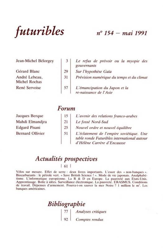 Futuribles 154, mai 1991. Gouverner sans prévoir