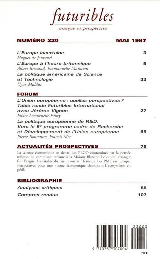 6. Futuribles 220, mai 1997. L'Europe à l'heure britannique