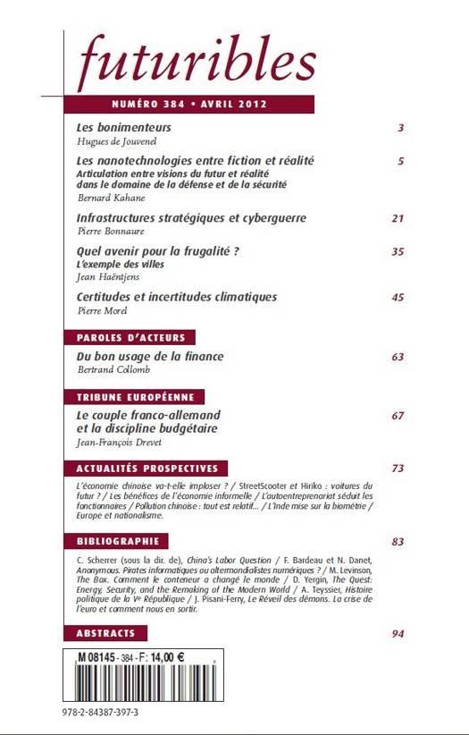 Actualités prospectives - L’économie chinoise va-t-elle imploser ? - StreetScooter et Hiriko : voitures du futur ? - Les bénéfices de l’économie informelle - L’autoentreprenariat séduit les fonctionnaires - Pollution chinoise : tout est relatif… - L’Inde mise sur la biométrie - Europe et nationalisme.