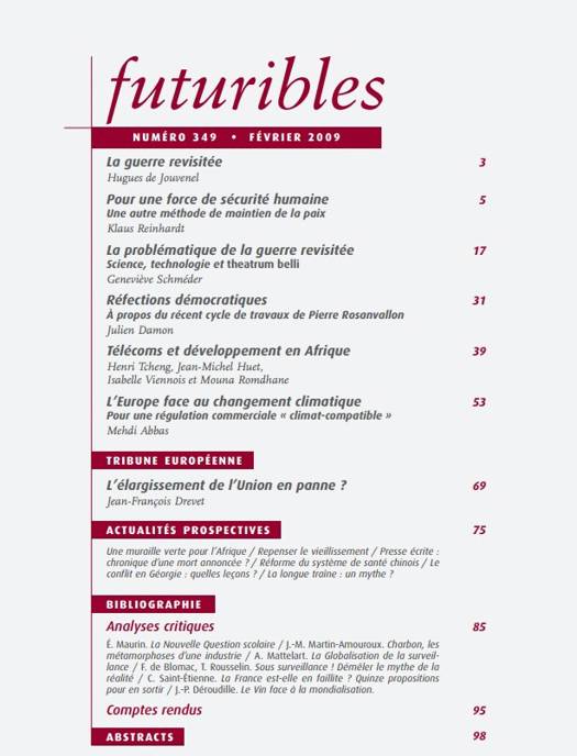 Bibliographie Analyses critiques - É. Maurin. La Nouvelle Question scolaire - J.-M. Martin-Amouroux. Charbon, les métamorphoses d’une industrie - A. Mattelart. La Globalisation de la surveillance - F. de Blomac, T. Rousselin. Sous surveillance ! Démêler le mythe de la réalité - C. Saint-Étienne. La France est-elle en faillite ? Quinze propositions pour en sortir - J.-P. Déroudille. Le Vin face à la mondialisation. Comptes rendus