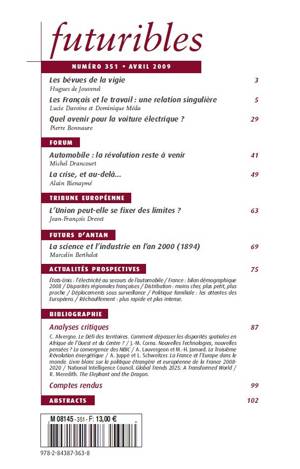 Actualités prospectives - États-Unis : l’électricité au secours de l’automobile - France : bilan démographique 2008 - Disparités régionales françaises - Distribution : moins cher, plus petit, plus proche - Déplacements sous surveillance - Politique familiale : les attentes des Européens - Réchauffement : plus rapide et plus intense.