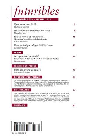 Bibliographie - J.-M. Chevalier. Les Nouveaux Défis de l’énergie - N. Stern. The Global Deal: Climate Change and the Creation of a New Era of Progress and Prosperity - J.-Y. Carfantan. Le Choc alimentaire mondial. Ce qui nous attend demain - O. Galland. Les Jeunes Français ont-ils raison d’avoir peur ? Éléments de réponse - G. Lambert. Vérole, cancer & cie. La société des maladies - J.-M. Besnier. Demain les posthumains.