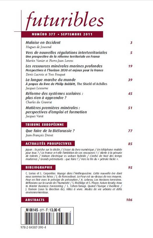 Bibliographie - C. Lorius et L. Carpentier. Voyage dans l’Anthropocène. Cette nouvelle ère dont nous sommes les héros - J. de Kervasdoué. La Peur est au-dessus de nos moyens. Pour en finir avec le principe de précaution - A. Lebeau. Les Horizons terrestres. Réflexions sur la survie de l’humanité - S. Morlidge et S. Player. Future Ready: How to Master Business Forecasting - L. Cohen-Tanugi. Quand l’Europe s’éveillera - J. Damon (sous la direction de). Villes à vivre. Modes de vie urbains et défis environnementaux.