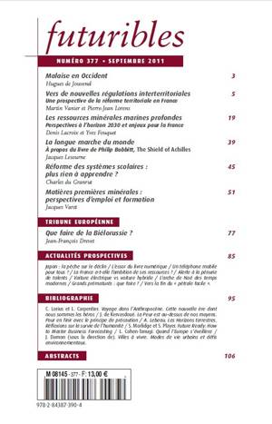 Actualités prospectives - Japon : la pêche sur le déclin - L’essor du livre numérique - Un téléphone mobile pour tous ? - La France a-t-elle l’ambition de ses ressources ? - Alerte à la pénurie de talents - Voiture électrique vs voiture hybride - L’arche de Noé des temps modernes - Grands prématurés : que faire ? - Vers la fin du « pétrole facile ».