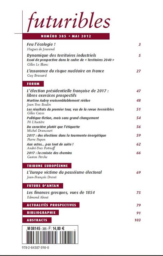 Forum L’élection présidentielle française de 2017 : libres exercices prospectifs - Martine Aubry vraisemblablement réélue par Jean-Yves Boulin - Les résultats du premier tour, vus de la revue Aveniribles par Gilles Cazes - Politique-fiction, mais sans grand changement par Pô L’Austère - Du caractère plutôt que l’étiquette par Michel Drancourt - 2017 : des élections dans la tourmente énergétique par Pierre Papon - Aux actes… pas tout de suite ! par André-Yves Portnoff - 2017 : la croisée des chemins par Gaston Perche