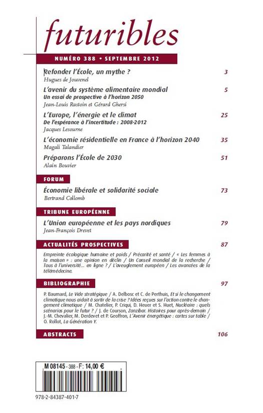 Bibliographie - P. Baumard, Le Vide stratégique - A. Delbosc et C. de Perthuis, Et si le changement climatique nous aidait à sortir de la crise ? - Idées reçues sur l’action contre le changement climatique - M. Chatelier, P. Criqui, D. Heuer et S. Huet, Nucléaire : quels scénarios pour le futur ? - J. de Courson, Zanzibar. Histoires pour après-demain - J.-M. Chevalier, M. Derdevet et P. Geoffron, L’Avenir énergétique : cartes sur table - O. Rollot, La Génération Y