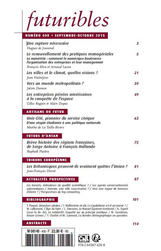 Bibliographie - T. Paquot, Désastres urbains - I. Wallerstein et alii, Le Capitalisme a-t-il un avenir ? - M. Lallement, L’Âge du faire - L. Davezies, Le Nouvel Égoïsme territorial - A. Supiot (sous la dir. de), La Solidarité. Enquête sur un principe juridique - M. Goodman, Future Crimes - Y. Charbit et M. Gaimard, La Bombe démographique en question.