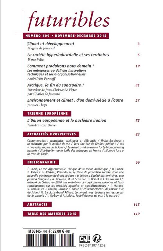 Bibliographie - É. Sadin, La Vie algorithmique. Critique de la raison numérique - B. Gazier, B. Palier et H. Périvier, Refonder le système de protection sociale. Pour une nouvelle génération de droits sociaux - P. Estèbe, L’Égalité des territoires, une passion française - A. Bonjean, M.-H. Schwoob, D. Boinet et C. Ly, Nourrir 1,5 milliard de Chinois en 2030. Les mutations des agricultures chinoises et leurs conséquences sur les marchés agricoles et agroalimentaires - F. Marano, R. Barouki et D. Zmirou, Toxique ? Santé et environnement : de l’alerte à la décision - U. Bardi, Le Grand Pillage. Comment nous épuisons les ressources de la planète - J. Gadrey et A. Lalucq, Faut-il donner un prix à la nature ?