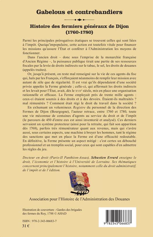 En exhumant un registre du personnel de la direction des fermes de Dijon, l'auteur retrace, entre 1760 et 1780, la vie méconnue de centaines d'agents au service du doit et de l'impôt. Ces derniers servaient un système protecteur (la retraite fait son apparition dès 1768), parfois très rémunérateur, mais qui s'avère aussi, sous certains aspects, une machine à broyer les hommes : le régime des sanctions que met en place la Ferme est d'une efficacité redoutable. En définitive, la Ferme présente un aspect mitigé.