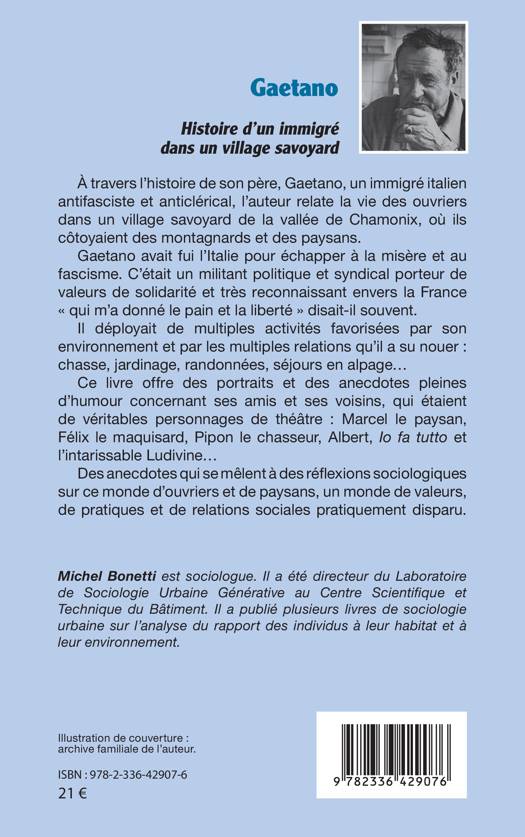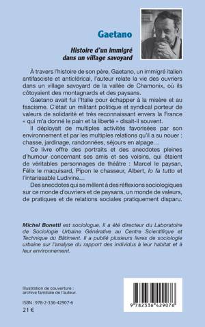 À travers l'histoire de son père, Gaetano, un immigré italien antifasciste et anticlérical, l'auteur relate la vie des ouvriers dans un village savoyard de la vallée de Chamonix, où ils côtoyaient des montagnards et des paysans. Gaetano avait fui l'Italie pour échapper à la misère et au fascisme. C'était un militant politique et syndical porteur de valeurs de solidarité et très reconnaissant envers la France qui m'a donné le pain et la liberté disait-il souvent. Il déployait de multiples activités favorisées par son environnement et par les multiples relations qu'il a su nouer: chasse, jardinage, randonnées, séjours en alpage... Ce livre offre des portraits et des anecdotes pleines d'humour concernant ses amis et ses voisins, qui étaient de véritables personnages de théâtre: Marcel le paysan, Félix le maquisard, Pipon le chasseur, Albert, Io fa tutto et l'intarissable Ludivine... Des anecdotes qui se mêlent à des réflexions sociologiques sur ce monde d'ouvriers et de paysans, un monde de valeurs, de pratiques et de relations sociales pratiquement disparu.