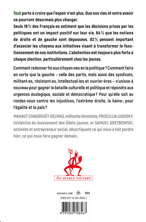 Tout porte à croire que l'espoir n'est plus. Que nos vies et notre avenir ne pourront désormais plus changer. Seuls 18% des Français·es estiment que les décisions prises par les politiques ont un impact positif sur leur vie, 64% que les notions de droite et de gauche sont dépassées. 82% pensent important d'associer les citoyens aux initiatives visant à transformer le fonctionnement de nos institutions. L'abstention est toujours plus forte à chaque élection, particulièrement chez les jeunes. Comment redonner foi aux citoyennes en la politique ? Comment faire en sorte que la gauche ¿ celle des partis, mais aussi des syndicats, militant·es, résistant·es, intellectuel·les et ouvrier·ères ¿ s'unisse à nouveau pour gagner la bataille culturelle et politique et répondre aux urgences écologique, sociale et démocratique ? Pour qu'elle soit au rendez-vous contre les injustices, l'extrême droite, la haine ; pour l'égalité et la paix ? MAHAUT CHAUDOUËT-DELMAS, militante féministe, PRISCILLIA LUDOSKY, initiatrice du mouvement des Gilets jaunes, et SAMUEL GRZYBOWSKI, activiste et entrepreneur social, décortiquent ce qui nous a fait perdre hier, ce qui nous fera gagner demain.