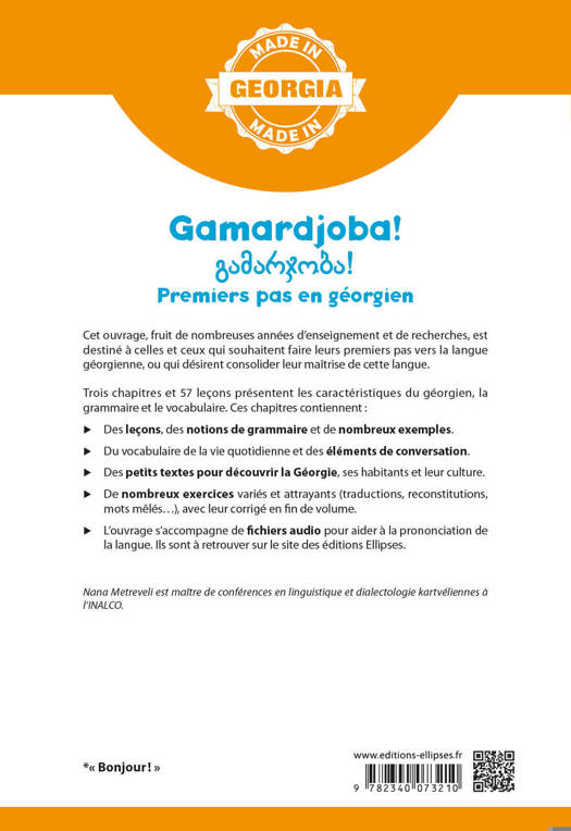 Cet ouvrage est destiné à celles et ceux qui souhaitent faire leurs premiers pas vers la langue géorgienne, ou qui désirent consolider leur maîtrise de cette langue.