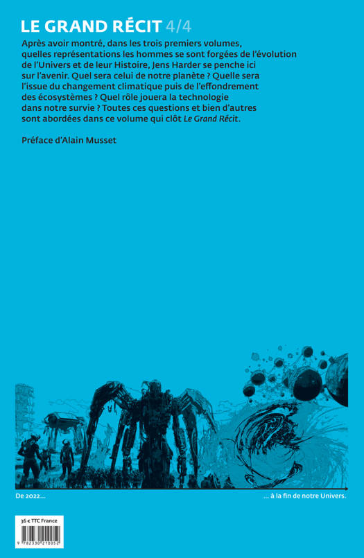 Après avoir montré, dans les trois premiers volumes, quelles représentations les hommes se sont forgées de l'évolution de l'Univers et de leur Histoire, Jens Harder se penche ici sur l'avenir. Quel sera celui de notre planète ? Quelle sera l'issue du changement climatique puis de l'effondrement des écosystèmes ? Quel rôle jouera la technologie dans notre survie ? Toutes ces questions et bien d'autres sont abordées dans ce volume qui clôt "Le Grand Récit".
