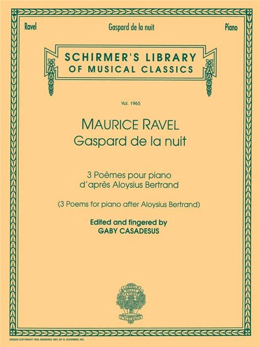 (Piano Solo). Ravel's greatest piano masterpiece, written in 1908, inspired by three poems by Aloysius Bertrand. In 3 movements: Ondine, Le Gibet, Scarbo. The poems on which the pieces are based are presented in this edition in both French and English. This newly researched edition includes pedaling and fingering by the editor.
