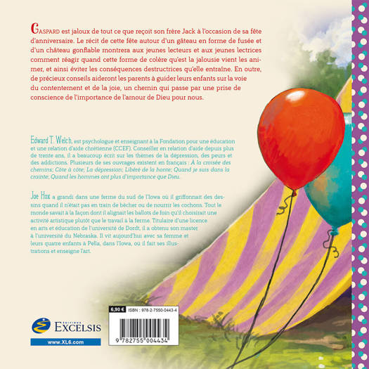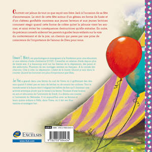 Gaspard est jaloux de tout ce que reçoit son frère Jack à l’occasion de sa fête d’anniversaire. Le récit de cette fête autour d’un gâteau en forme de fusée et d’un château gonflable montrera aux jeunes lecteurs et aux jeunes lectrices comment réagir quand cette forme de colère qu’est la jalousie vient les animer, et ainsi éviter les conséquences destructrices qu’elle entraîne. En outre, de précieux conseils aideront les parents à guider leurs enfants sur la voie du contentement et de la joie, un chemin qui passe par une prise de conscience de l’importance de l’amour de Dieu pour nous.
