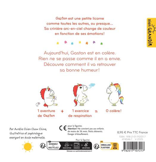 Gaston est une petite licorne différente des autres. Il a une particularité : sa crinière porte les couleurs de l'arc-en-ciel lorsqu'il va bien, mais dès qu'une émotion forte le submerge, sa crinière et sa queue changent de couleur selon son humeur : la tristesse, la colère ou encore la joie par exemple. Aujourd’hui, Gaston se sent vraiment très mal ! Peu importe ce qu’il fait, tout va de travers : il est en colère. Apprends à chasser le nuage de colère avec Gaston, grâce aux petits gestes magiques (petits exercices très simples) pour t’aider à apprivoiser tes émotions. Un album très utile et une figurine à collectionner de ta licorne préférée ! Une série d'albums écrite et illustrée par Aurélie Chien Chow Chine, sophrologue pour les adultes et les enfants. Elle exerce notamment dans les écoles maternelles.