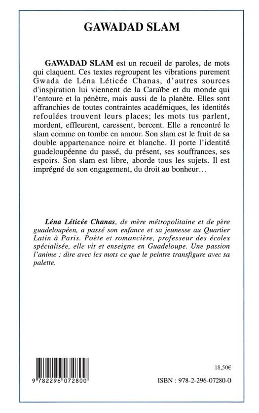 Recueil de paroles, de mots qui claquent, ces textes regroupent les vibrations purement Gwada de Léna Léticée Chanas. D'autres sources d'inspiration lui viennent de la Caraïbe et du monde qui l'entoure et la pénètre, mais aussi de la planète. Les mots tus, parlent, mordent, effleurent, caressent, bercent. Son slam est le fruit de sa double appartenance noire et blanche. Il porte l'identité guadeloupéenne du passé, du présent, ses souffrances, ses espoirs.
