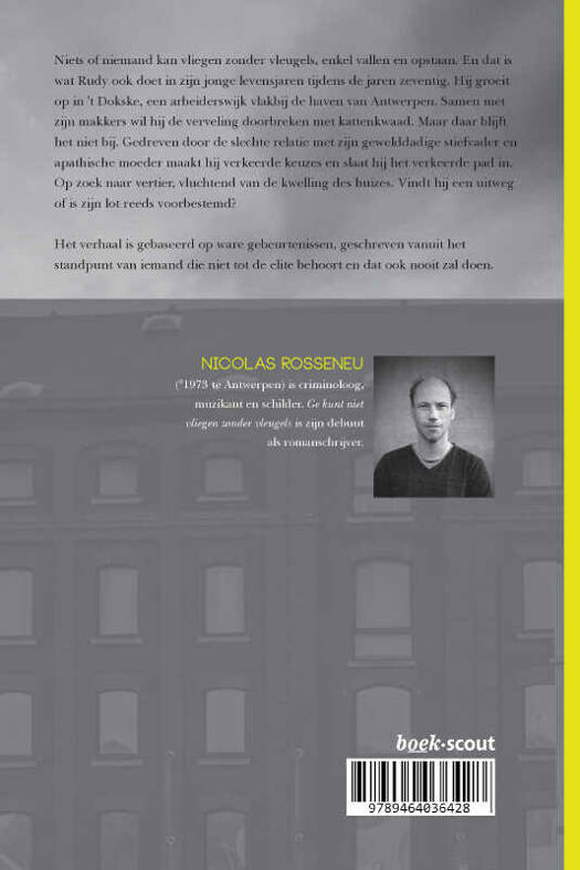 Niets of niemand kan vliegen zonder vleugels, enkel vallen en opstaan. En dat is wat Rudy ook doet in zijn jonge levensjaren tijdens de jaren zeventig. Hij groeit op in 't Dokske, een arbeiderswijk vlakbij de haven van Antwerpen. Samen met zijn makkers wil hij de verveling doorbreken met kattenkwaad. Maar daar blijft het niet bij. Gedreven door de slechte relatie met zijn gewelddadige stiefvader en pathische moeder maakt hij verkeerde keuzes en slaat hij het verkeerde pad in. Op zoek naar vertier, vluchtend van de kwelling des huizes. Vindt hij een uitweg of is zijn lot reeds voorbestemd? Het verhaal is gebaseerd op ware gebeurtenissen.