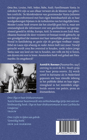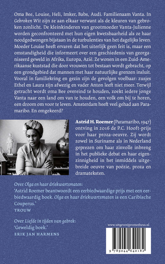 Oma Bee, Louise, Heli, Imker, Babs, Audi. Familienaam Vanta. In Gebroken Wit zijn ze aan elkaar verwant als de kleuren van gebroken zonlicht. De kleinkinderen van grootmoeder Vanta-Julienne worden geconfronteerd met hun eigen kwetsbaarheid als ze haar noodgedwongen bijstaan in de turbulenties van het dagelijks leven. Moeder Louise heeft ervaren dat het uiterlijk geen feit is, maar een omstandigheid die informeert over een geschiedenis van georganiseerd geweld in Afrika, Europa, Azië. Ze wonen in een Zuid-Amerikaanse kuststad die door vrouwen tot bestaan wordt gebracht, op een grondgebied dat mannen met haar natuurlijke grenzen insluit. Vooral in familiekring en gezin zijn de gevolgen voelbaar: zusjes Ethel en Laura zijn afwezig en vader Anton leeft niet meer. Terwijl getracht wordt oma Bee overeind te houden, zoekt iedere jonge Vanta naar een land om van te houden, een volk om bij te horen, een droom om voor te leven. Amsterdam heeft veel gehad aan Paramaribo. En omgekeerd?