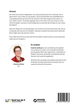 Geef me de 5 is geschreven naar ouders en opvoeders toe. Een kind met autisme begeleiden, Hoe doe je dat? Daar gaat dit boek over. Het is geschreven vanuit de behoefte aan duidelijkheid en voorspelbaarheid die het kind met autisme nodig heeft. Het kind vraagt als het ware van ons: ‘Geef me de 5.’ Of anders gezegd: Wat is mijn taak, Hoe voer ik het uit, Waar vindt het plaats, Wanneer moet ik beginnen en Wanneer ben ik klaar, en Wie is erbij betrokken? Doordat er uitleg wordt gegeven over wat de gevolgen van autisme voor het kind kunnen zijn, leert men al lezende ook de bijbehorende wijze van handelen hanteren. Hierdoor ontstaat het inzicht wat de schrijfster noemt: ‘de Auti-bril opzetten’. Door deze Auti-bril kun je zien Hoe het kind denkt, zodat je daar op een passende wijze op kunt reageren.