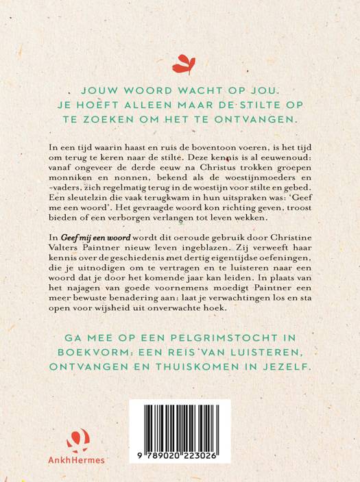In 'Geef mij een woord' wordt dit oeroude gebruik door Christine Valters Paintner nieuw leven ingeblazen. Zij verweeft haar kennis over de geschiedenis met dertig eigentijdse contemplatieve en creatieve oefeningen, die je uitnodigen om te vertragen en te luisteren naar een woord dat je door het komende jaar kan leiden. In plaats van het najagen van goede voornemens moedigt Paintner een meer bewuste benadering aan: laat je verwachtingen los en sta open voor wijsheid uit onverwachte hoek. Ze leidt je op een zachte manier door het proces van het ontvangen van je woord, het testen van de weerklank en het omarmen van de betekenis ervan. Als je over jouw woord nadenkt en ernaar leeft, merk je dat het je inzicht, duidelijkheid en doelgerichtheid biedt.