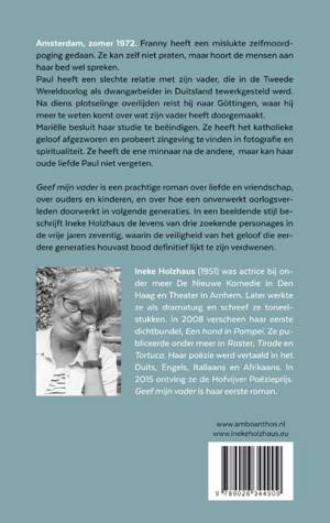 Dichter Ineke Holzhaus beschrijft de levens van drie zoekende personages in de vrije jaren zeventig, waarin de veiligheid van het geloof die eerdere generaties houvast bood definitief lijkt te zijn verdwenen. Amsterdam, zomer 1972. Franny heeft een mislukte zelfmoordpoging gedaan. Ze kan zelf niet praten, maar hoort de mensen aan haar bed wel spreken. Paul heeft een slechte relatie met zijn vader, die in de Tweede Wereldoorlog als dwangarbeider in Duitsland tewerkgesteld werd. Na diens plotselinge overlijden reist hij naar Göttingen, waar hij meer te weten komt over wat zijn vader heeft doorgemaakt. Mariëlle besluit haar studie te beëindigen. Ze heeft het katholieke geloof afgezworen en probeert zingeving te vinden in fotografie en spiritualiteit. Ze heeft de ene minnaar na de andere, maar kan haar oude liefde Paul niet vergeten. 'Geef mijn vader' van Ineke Holzhaus is een prachtig verhaal over liefde en vriendschap, over ouders en kinderen, en over hoe een onverwerkt oorlogsverleden doorwerkt in volgende generaties.