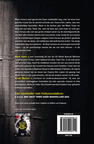 Maar in de dertien jaar dat Mark Owen leiding gaf aan seal Team Six, nam hij deel aan veel meer en veel grotere missies die ook van grote invloed waren op de wereldgeschiedenis. Niet alle missies waren even succesvol, maar zowel de successen als de mislukkingen dragen volgens Owen bij aan de perfect geoliede machine van de Seals, het elitekorps dat leeft bij het motto: ‘De enige makkelijke dag was gisteren.’ Al deze missies en ervaringen beschrijft Owen – op de openhartige manier die we van hem kennen – in dit nieuwe, spannende boek.