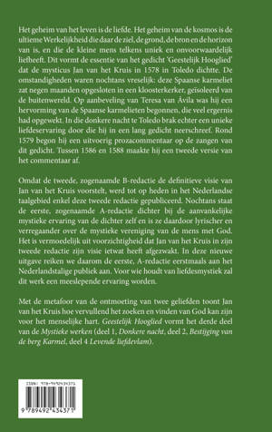Het is vermoedelijk uit voorzichtigheid dat Jan van het Kruis in zijn tweede redactie zijn visie ietwat heeft afgezwakt. In deze nieuwe uitgave reiken we daarom de eerste, A-redactie eerstmaals aan het Nederlandstalige publiek aan. Voor wie houdt van liefdesmystiek zal dit werk een meeslepende ervaring worden.