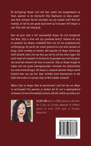 De dertigjarige Vesper runt met haar ouders een bungalowpark op Texel,wanneer ze de charmante Stijn Daalhuizen en diens puberzoon Nick ontmoet. Na het overlijden van zijn moeder heeft Nick het moeilijk,en dat hij een goede band weet op te bouwen met Vesper is voor Stijn meer dan belangrijk. Door de jaren heen is het voornamelijk Vesper die zich bezighoudt met Nick, Stijn is druk met zijn groeiende bedrijf. Ondanks de zorg en aandacht van Vesper, ontwikkelt Nick zich tot een problematische achttienjarige. Hij wordt van school gestuurd en zijn leven bestaat uit drugs, foute vrienden en feesten. Net wanneer hij Vesper beterschap heeft beloofd, dient zich een klus aan die hij niet kan laten liggen. Die nacht loopt het compleet uit de hand en de gevolgen voor het hele gezin zijn vanaf dat moment niet meer te overzien. Stijn en Vesper krijgen te maken met een groep levensgevaarlijke criminelen die nietsontziend hun leven binnendringen. Het drama is compleet wanneer Vesper wordt herkend door een van hen. Haar verleden komt bovendrijven en dat blijkt heel anders te zijn dan Stijn en Nick hadden verwacht. Weten Stijn en Vesper Nick te beschermen? Lukt het hen om elkaar te vertrouwen? Pas wanneer ze denken dat de rust is wedergekeerd ontvouwt zich een afschuwelijk scenario, dat alle relaties op scherp zet.