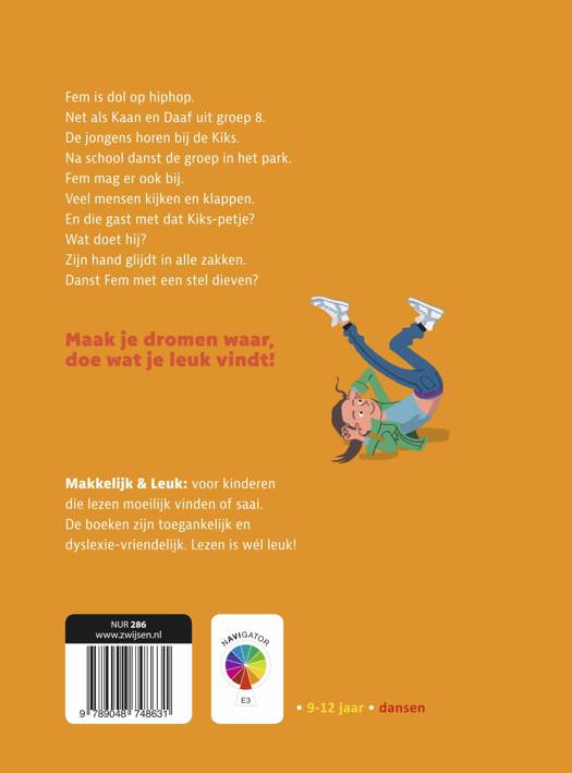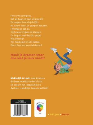 Fem danst de hele dag en is gek op hiphop. Dan mag ze meedansen met de Kiks, een hiphopgroep die na schooltijd in het park danst. Fem voelt zich geweldig, totdat haar vriendin haar vertelt dat er iets niet klopt in de groep. Danst Fem met dieven of is er iets anders aan de hand? Aansprekend verhaal op laag AVI-niveau (AVI E3) voor kinderen van 9 tot 12 jaar. De serie ‘Makkelijk & Leuk’ is speciaal gemaakt voor kinderen die lezen moeilijk vinden of saai. Zo krijgen zij weer plezier in lezen. Dyslexievriendelijk!
