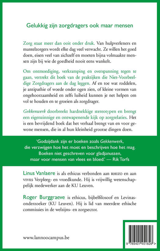 Gekkenwerk doorbreekt hardnekkige stereotypen en brengt een eigenzinnige en ontwapenende kijk op zorgrelaties. Het is een bevrijdend boek dat het verhaal brengt van en voor gewone mensen, die in al hun kleinheid grootse dingen doen.