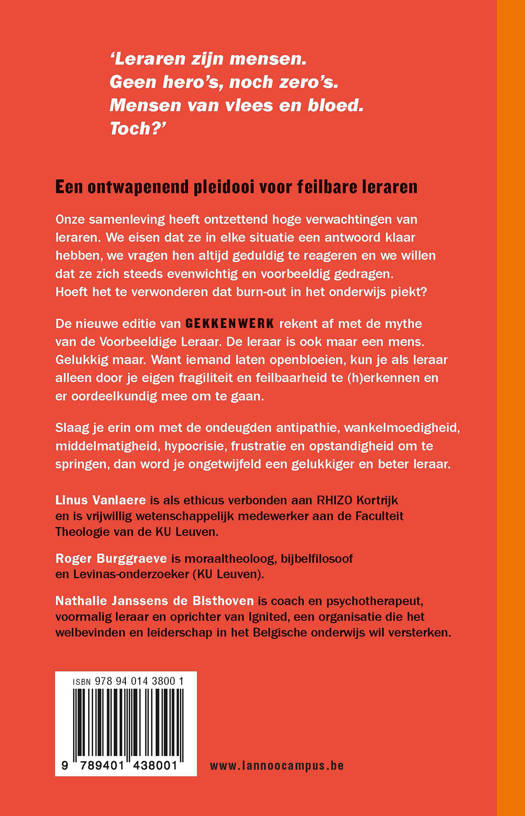 Onze samenleving heeft ontzettend hoge verwachtingen van leraren. We eisen dat ze in elke situatie een antwoord klaar hebben, we vragen hen altijd geduldig te reageren en we willen dat ze zich steeds evenwichtig en voorbeeldig gedragen. Hoeft het te verwonderen dat burn-out in het onderwijs piekt? De nieuwe editie van GEKKENWERK rekent af met de mythe van de Voorbeeldige Leraar. De leraar is ook maar een mens. Gelukkig maar. Want iemand laten openbloeien, kun je als leraar alleen door je eigen fragiliteit en feilbaarheid te (h)erkennen en er oordeelkundig mee om te gaan. Slaag je erin om met de ondeugden antipathie, wankelmoedigheid, middelmatigheid, hypocrisie, frustratie en opstandigheid om te springen, dan word je ongetwijfeld een gelukkiger en beter leraar.