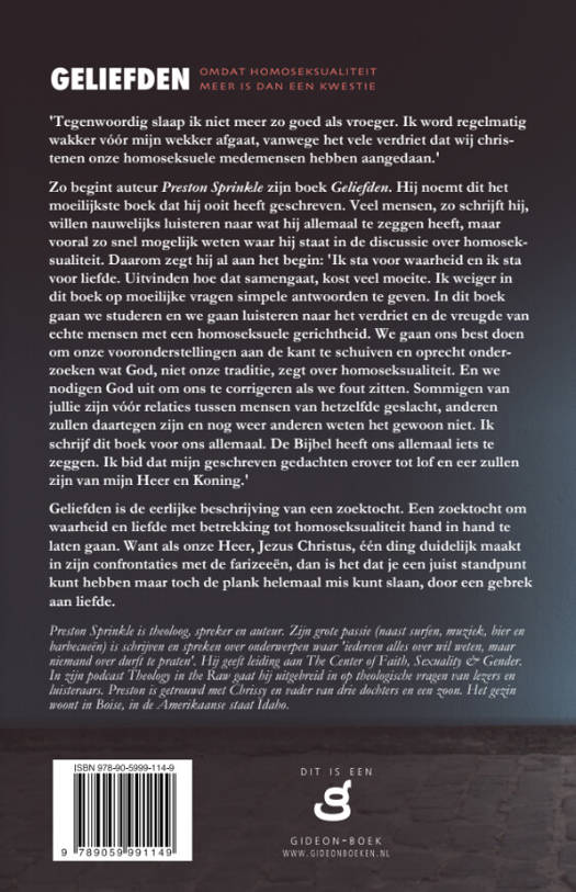 GELIEFDEN OMDAT HOMOSEKSUALITEIT MEER IS DAN EEN KWESTIE 'Tegenwoordig slaap ik niet meer zo goed als vroeger. Ik word regelmatig wakker vóór mijn wekker afgaat, vanwege het vele verdriet dat wij christenen onze homoseksuele medemensen hebben aangedaan.' Zo begint auteur Preston Sprinkle zijn boek Geliefden. Hij noemt dit het moeilijkste boek dat hij ooit heeft geschreven. Veel mensen, zo schrijft hij, willen nauwelijks luisteren naar wat hij allemaal te zeggen heeft, maar vooral zo snel mogelijk weten waar hij staat in de discussie over homoseksualiteit. Daarom zegt hij al aan het begin: 'Ik sta voor waarheid en ik sta voor liefde. Uitvinden hoe dat samengaat, kost veel moeite. Ik weiger in dit boek op moeilijke vragen simpele antwoorden te geven. In dit boek gaan we studeren en we gaan luisteren naar het verdriet en de vreugde van echte mensen met een homoseksuele gerichtheid. We gaan ons best doen om onze vooronderstellingen aan de kant te schuiven en oprecht onder- zoeken wat God, niet onze traditie, zegt over homoseksualiteit. En we nodigen God uit om ons te corrigeren als we fout zitten. Sommigen van jullie zijn vóór relaties tussen mensen van hetzelfde geslacht, anderen zullen daartegen zijn en nog weer anderen weten het gewoon niet. Ik schrijf dit boek voor ons allemaal. De Bijbel heeft ons allemaal iets te zeggen. Ik bid dat mijn geschreven gedachten erover tot lof en eer zullen zijn van mijn Heer en Koning.' Geliefden is de eerlijke beschrijving van een zoektocht. Een zoektocht om waarheid en liefde met betrekking tot homoseksualiteit hand in hand te laten gaan. Want als onze Heer, Jezus Christus, één ding duidelijk maakt in zijn confrontaties met de farizeeën, dan is het dat je een juist standpunt kunt hebben maar toch de plank helemaal mis kunt slaan, door een gebrek aan liefde. Preston Sprinkle is theoloog, spreker en auteur. Zijn grote passie (naast surfen, muziek, bier en barbecueën) is schrijven en spreken over onderwerpen waar 'iedereen alles over wil weten, maar niemand over durft te praten'. Hij geeft leiding aan The Center of Faith, Sexuality & Gender. In zijn podcast Theology in the Raw gaat hij uitgebreid in op theologische vragen van lezers en luisteraars. Preston is getrouwd met Chrissy en vader van drie dochters en een zoon. Het gezin woont in Boise, in de Amerikaanse staat Idaho.