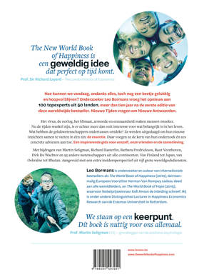 Hoe kunnen we vandaag, ondanks alles, toch nog een beetje gelukkig en hoopvol blijven? Onderzoeker Leo Bormans vroeg het opnieuw aan 100 topexperts uit 50 landen, meer dan tien jaar na de eerste editie van deze wereldwijde bestseller. Nieuwe Tijden vragen om Nieuwe Antwoorden. Het virus, de oorlog, het klimaat, armoede en eenzaamheid maken mensen onzeker. Nu de tijden wankel zijn, is er echter meer dan ooit interesse voor wat belangrijk is in het leven. Wat hebben de gelukwetenschappers ondertussen ontdekt? Ze werden uitgedaagd om hun nieuwe inzichten samen te vatten in één zin: de essentie. Daar voegen ze de kern van hun onderzoek én zes concrete adviezen aan toe. Een inspirerende gids voor onszelf, onze vrienden en de samenleving. Met bijdragen van Martin Seligman, Richard Easterlin, Barbara Fredrickson, Ruut Veenhoven, Dirk De Wachter en 95 andere wetenschappers uit alle continenten. Van Finland tot Japan, van Oekraïne tot Bhutan. Aangevuld met een extra insiders perspectief uit vijf grote wereldgodsdiensten. "We staan op een keerpunt. Dit boek is nuttig voor ons allemaal." - Prof. Martin Seligman (VS), grondlegger van de positieve psychologie "The New World Book of Happiness is een geweldig idee dat perfect op tijd komt." - Prof. Sir Richard Layard, The London School of Economics