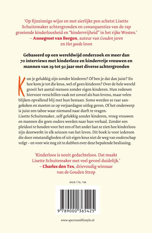 Kun je gelukkig zijn zonder kinderen? Of ben je dat dan juist? En hoe kom je tot die keus, wel of geen kinderen? Over de hele wereld groeit het aantal mensen zonder eigen kinderen. Hun redenen hiervoor verschillen vaak net zoveel als hun levens, maar velen blijken opvallend blij met hun bestaan. Soms worden ze raar aangekeken en moeten ze op verjaardagen uitleg geven. Of het onderwerp is juist een taboe waar niemand naar durft te vragen. Lisette Schuitemaker, zelf gelukkig zonder kinderen, vroeg vrouwen en mannen die geen ouders werden naar hun verhaal. Zonder een pleidooi te houden voor het een of het ander laat ze zien hoe kinderloos zijn doorwerkt in elk seizoen van het leven. Dit boek is voor iedereen die door omstandigheden of uit eigen keus niet de weg van ouderschap volgt – en voor wie nog zit te dubben over deze bepalende beslissing.