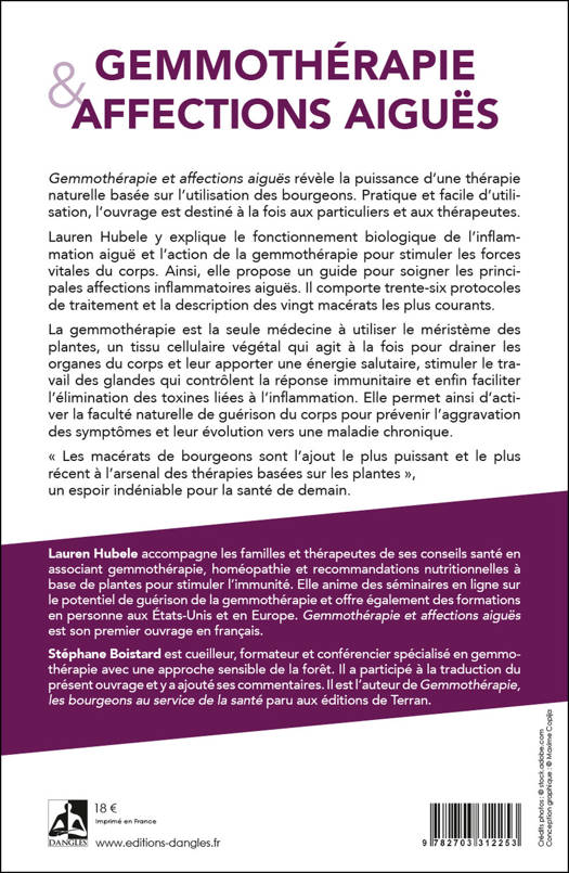 ''Gemmothérapie et affections aiguës'' révèle la puissance d’une thérapie naturelle basée sur l’utilisation des bourgeons. Pratique et facile d’utilisation, l’ouvrage est destiné à la fois aux particuliers et aux thérapeutes. Lauren Hubele y explique le fonctionnement biologique de l’inflammation aiguë et l’action de la gemmothérapie pour stimuler les forces vitales du corps. Ainsi, elle propose un guide pour soigner les principales affections inflammatoires aiguës. Il comporte trente-six protocoles de traitement et la description des vingt macérats les plus courants. « Les macérats de bourgeons sont l’ajout le plus puissant et le plus récent à l’arsenal des thérapies basées sur les plantes », un espoir indéniable pour la santé de demain.
